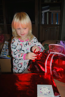 Tessa couldn't open the wrapped ones but she managed to open a bag from my parents.